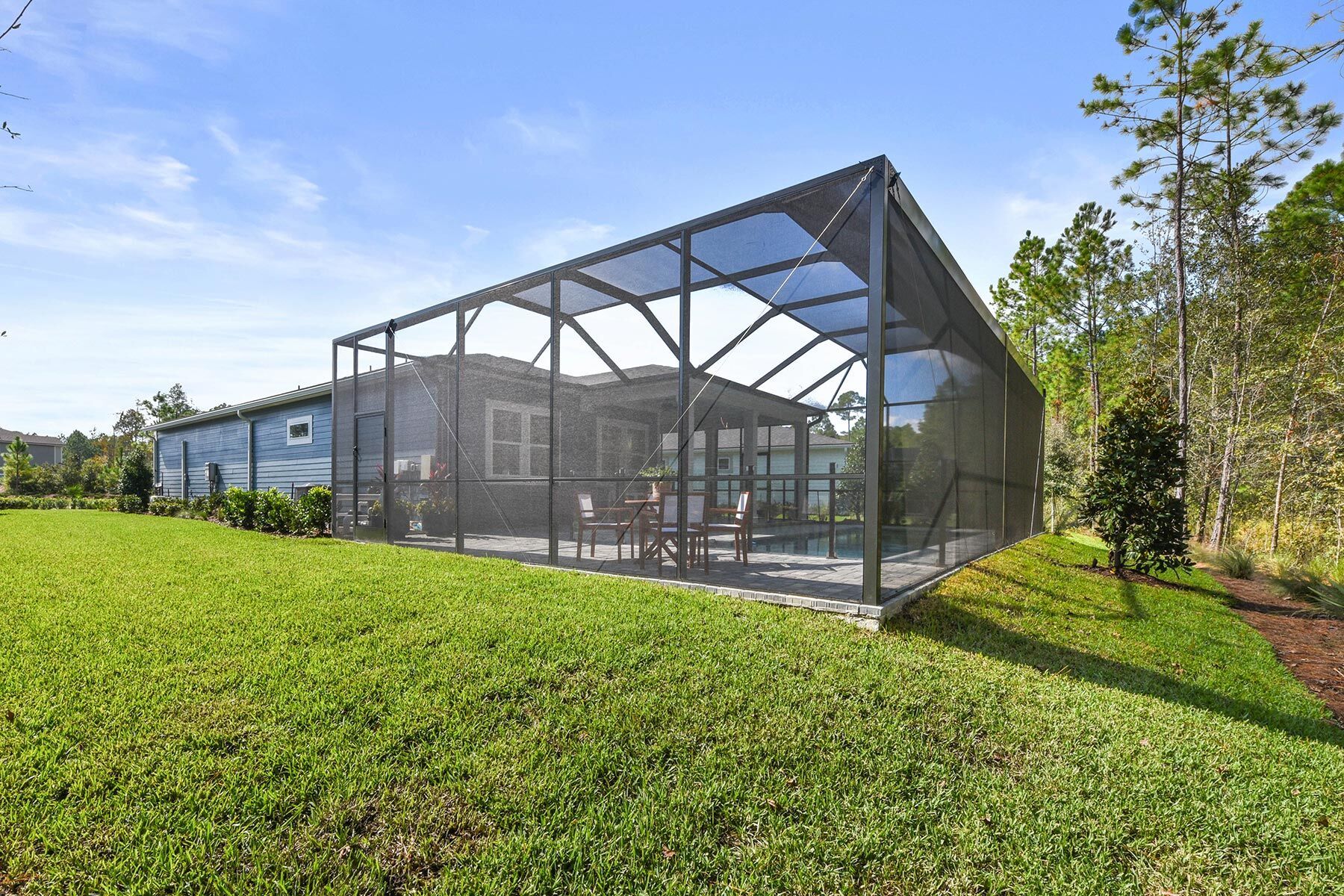The Court floor plan provides 2 bedrooms plus a study, along with 2 full baths and a Golf Cart Garage. It boasts a Gourmet Kitchen with Quartz countertops throughout. The Owner's suite includes a spa shower with a zero-entry feature and a bench. The home features an open concept design and an extended lanai, ideal for hosting and entertaining guests.