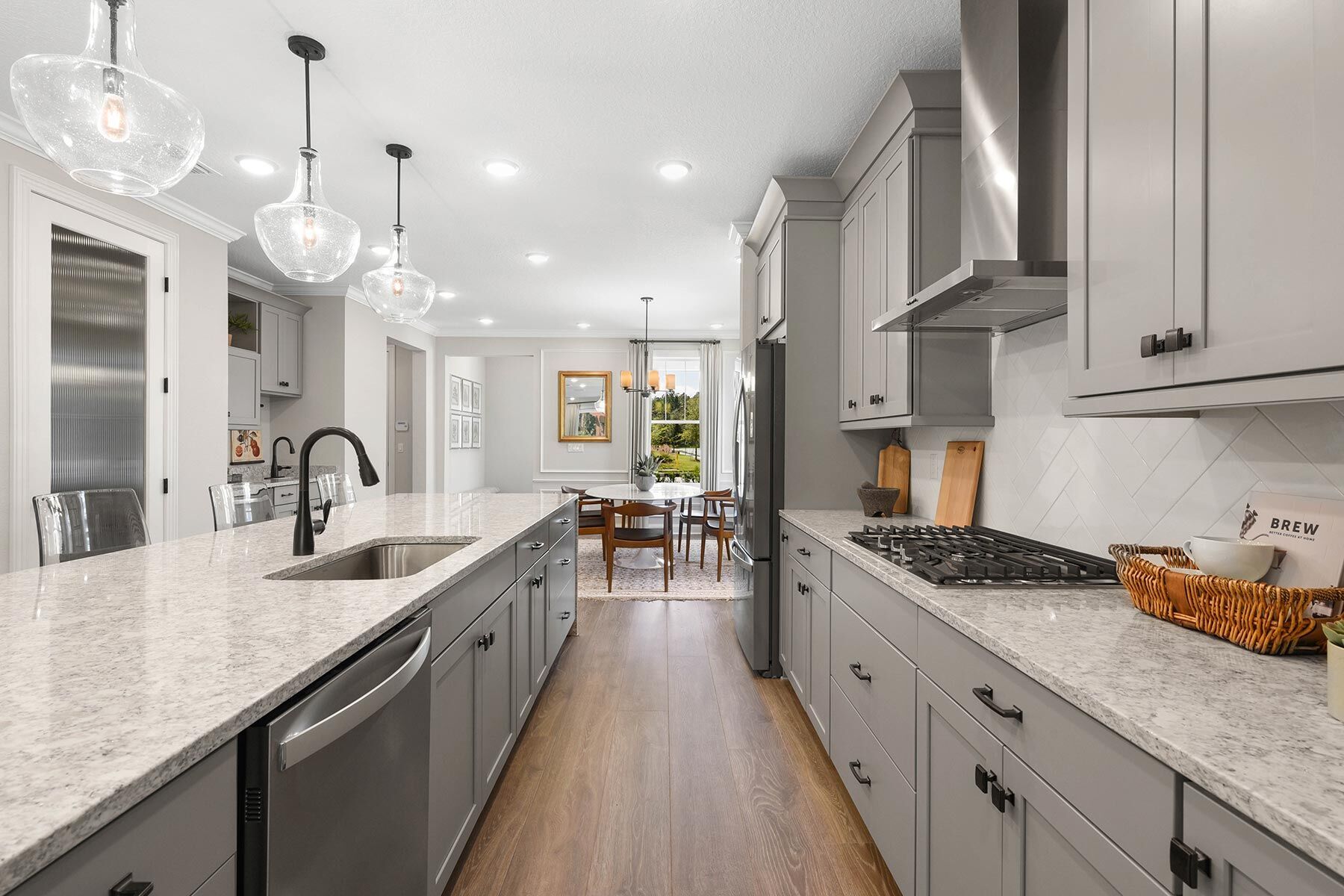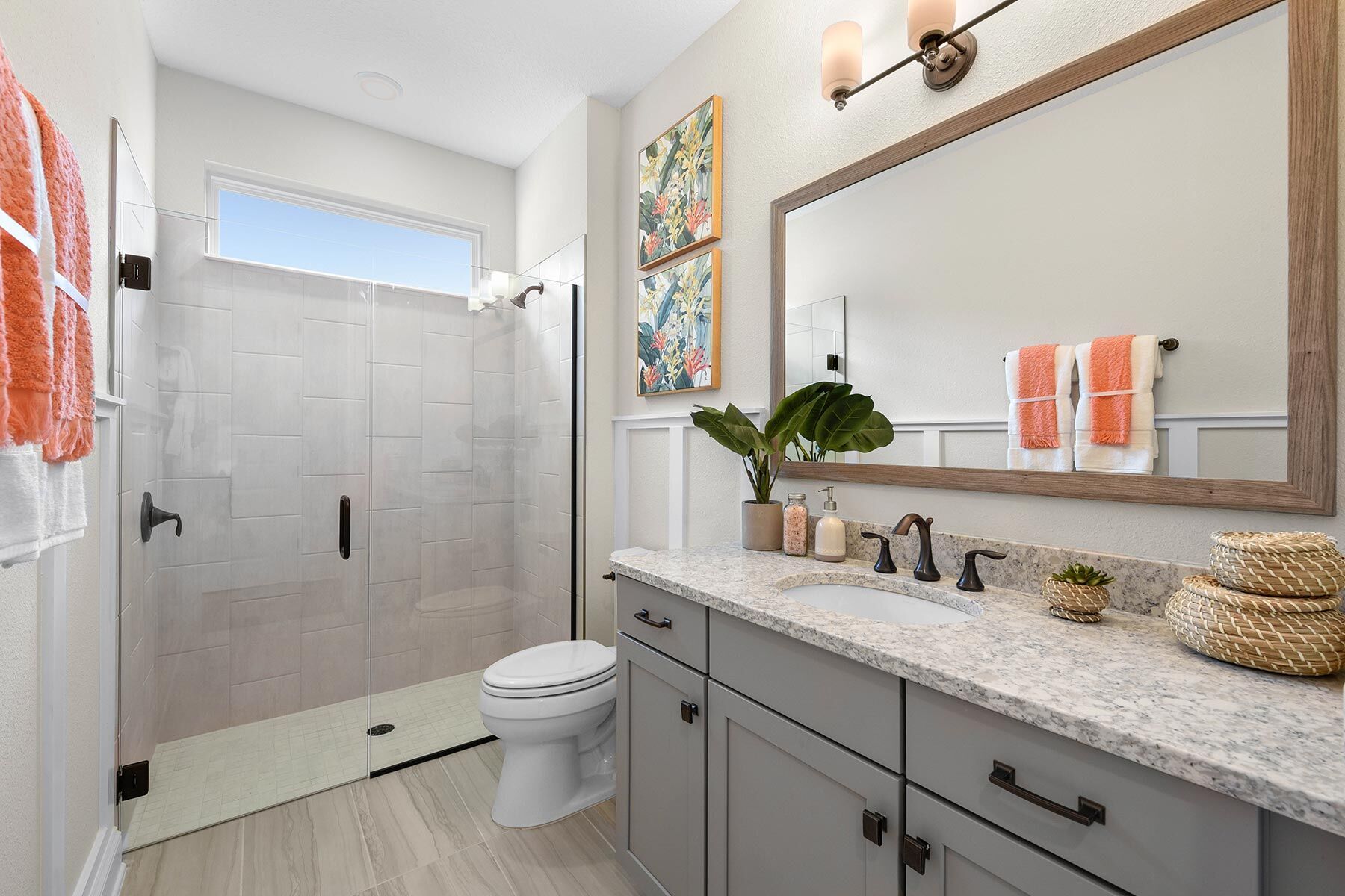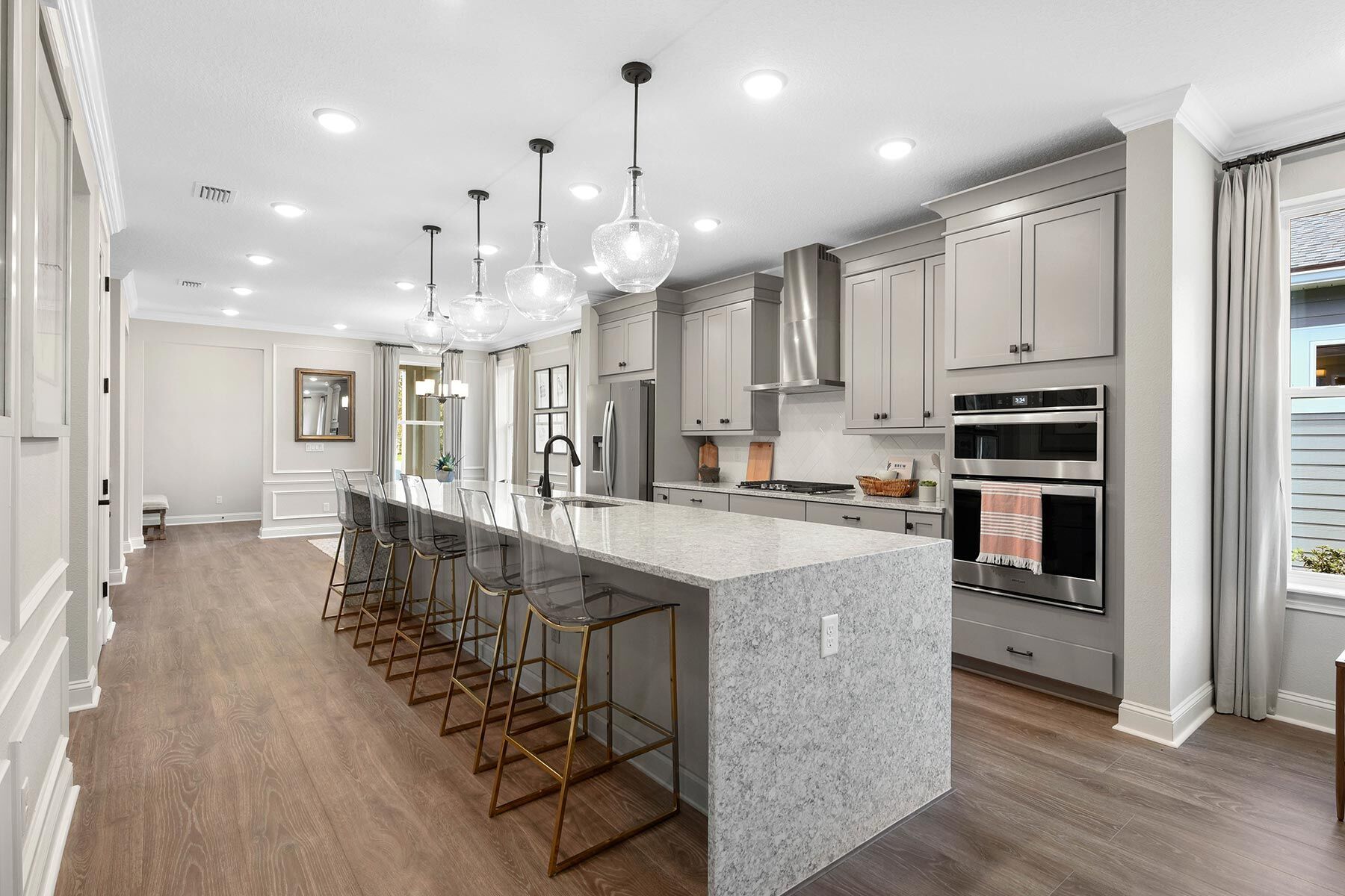 This Craftsman Lanes light-washed spaciousness highlights the contemporary design whose dining room, island-and-breakfast-bar kitchen, and family room flow seamlessly together. The foyer provides a direct view to the covered lanai. In the back corner of the home, the owners suite boasts a massive walk-in closet and a lavish bath. The selected options for this Lane are: study in lieu of flex room, 4' garage extension, extended covered lanai, spa shower, and gourmet kitchen.